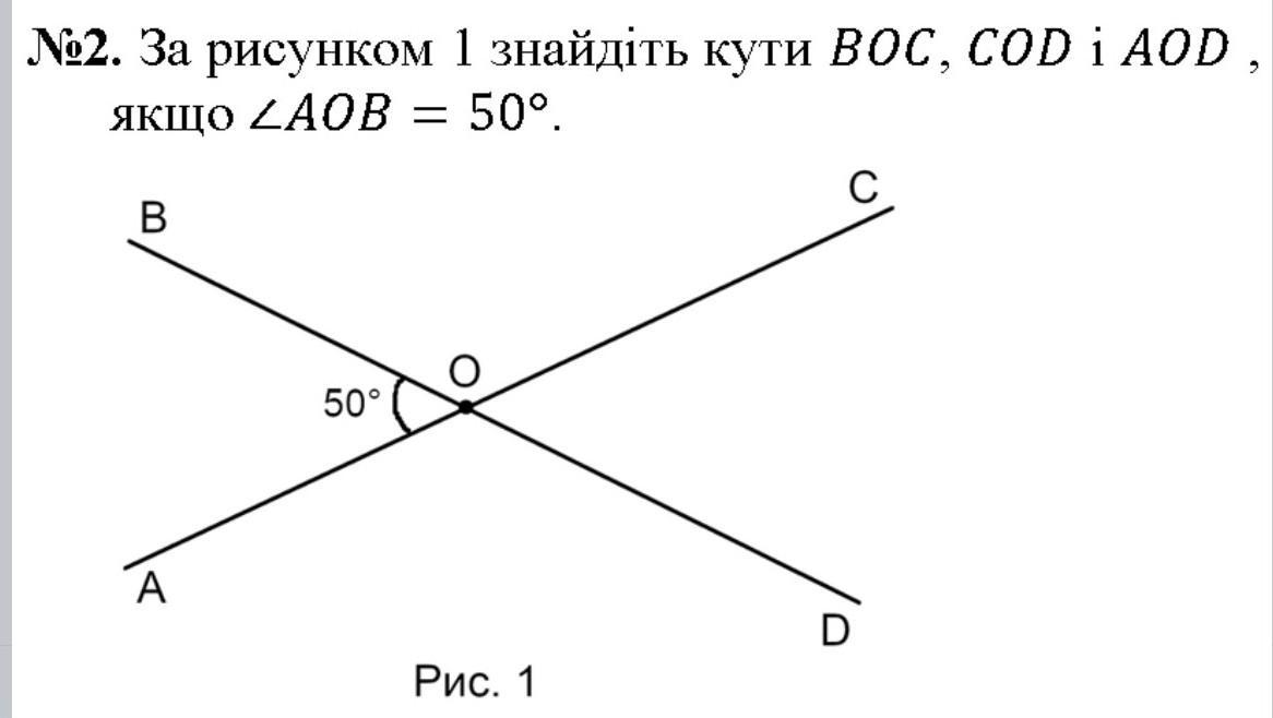AOB перпендикулярный COD поэтому 50 градусов а BOC 130 потому что если открытый кут то 180 триста 180-50=130 ну а ВОС пердендикулярен AOD