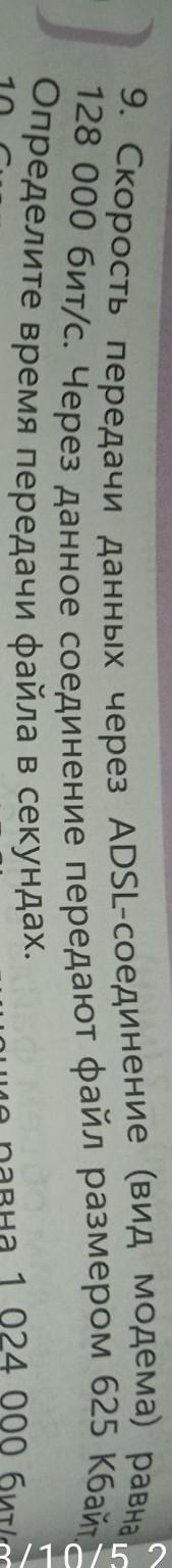 Применение 128 000 бит/с. Через данное соединение передают файл размером 625 Кбайт 9. Скорость передачи данных через ADSL-соединение (вид модема) равна Определите время передачи файла в секундах. плинение равна 1 024 999