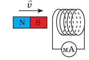 На рис. зображено штабовий магніт, котушку, приєднану до міліамперметра, та зазначено напрямок швидкості руху магніту. Укажіть магнітні полюси котушки.