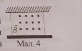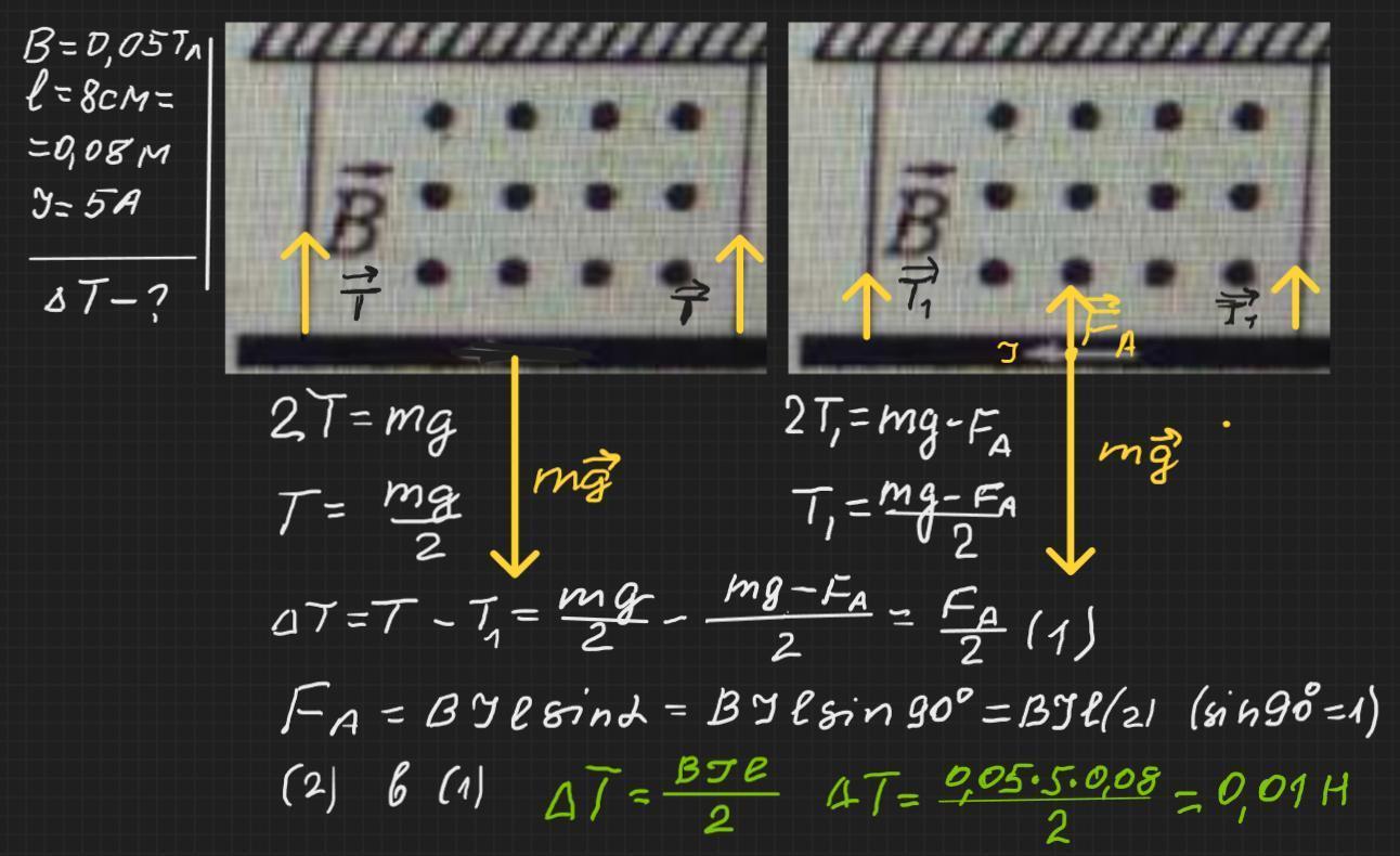 В однорідному магнітному полі,індукція якого 0,5ТЛ підвішений провідник масою 40г і довжиною 40 см мал.4 якої сили струм потрібно пропустити в провіднику і в якому напрямку щоб сила натягу ниток зменшилася вдвічі?
