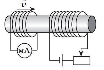 Обери правильну відповідь. На рисунку зображено котушки, з’єднані осердям. Укажи напрям індукційного струму котушки, що з’єднана з міліамперметром, в момент руху котушки відносно осердя.
