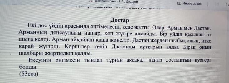 Кортынды :Ит Арманга шабуыл жасаганда Дастан оны иттен шабыкпен коргауы жанеде осы окиганы естиген аксакалдын нагыз достык бар екенине куагер болуы