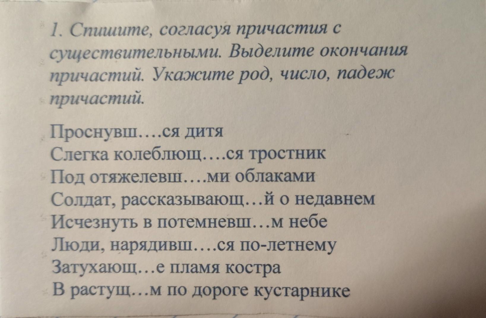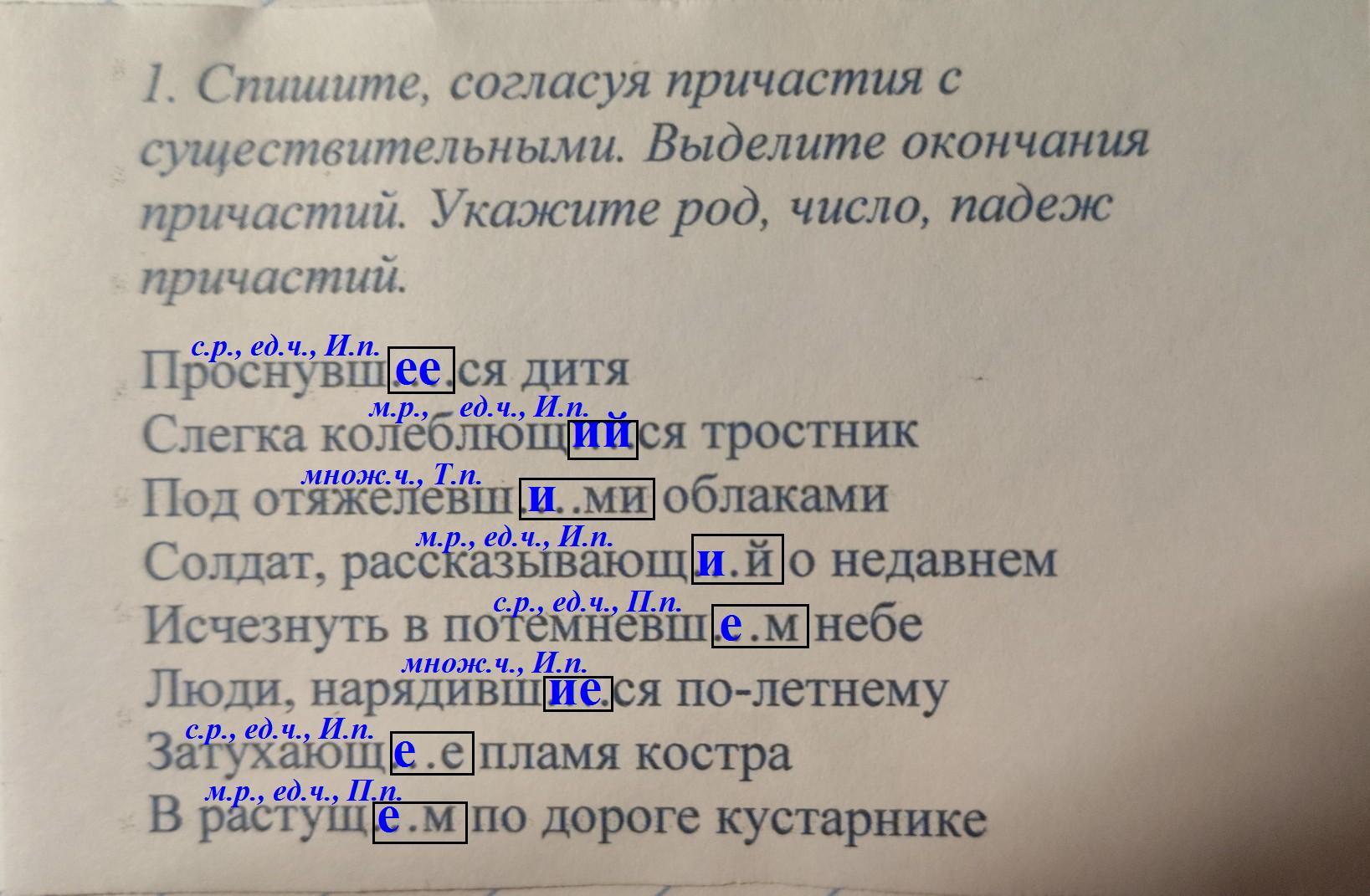 Спишите согласуя причастие с существительными Выделите окончания причастий Укажите род число падеж в причастий