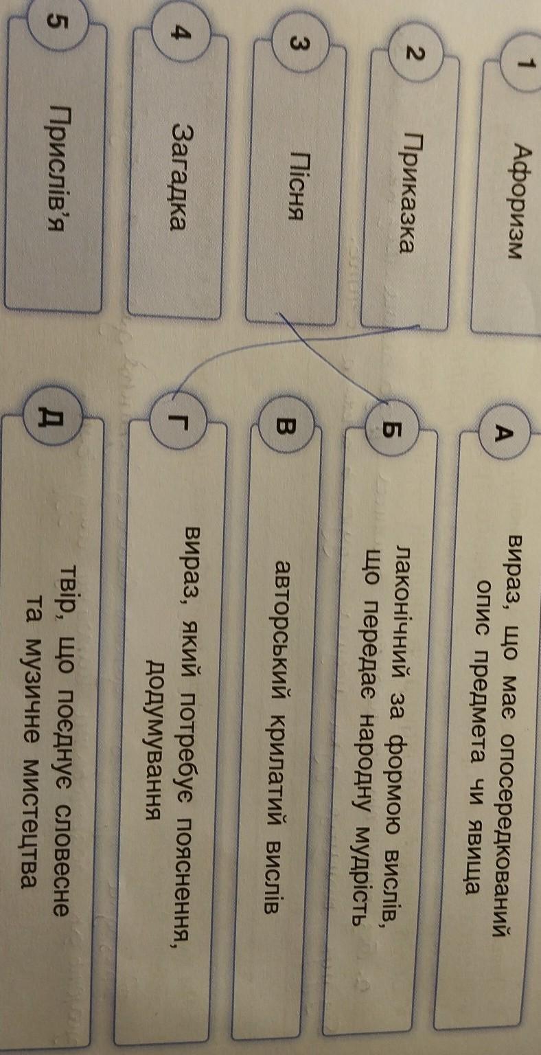 5 3 4 2 1. Установи відповідність. 1 Афоризм Приказка Пісня Загадка Прислів'я A Б B Г Д вираз, що має опосередкований опис предмета чи явища лаконічний за формою вислів, що передае народну мудрість авторський крилатий вислів вираз, який потребує пояснення, додумування твір, що поєднує словесне та музичне мистецтва ДАМ 10 БАЛІВ ЗАВТРА У 8:00 ЗДАВАТИ ЗАРУБІЖНУ