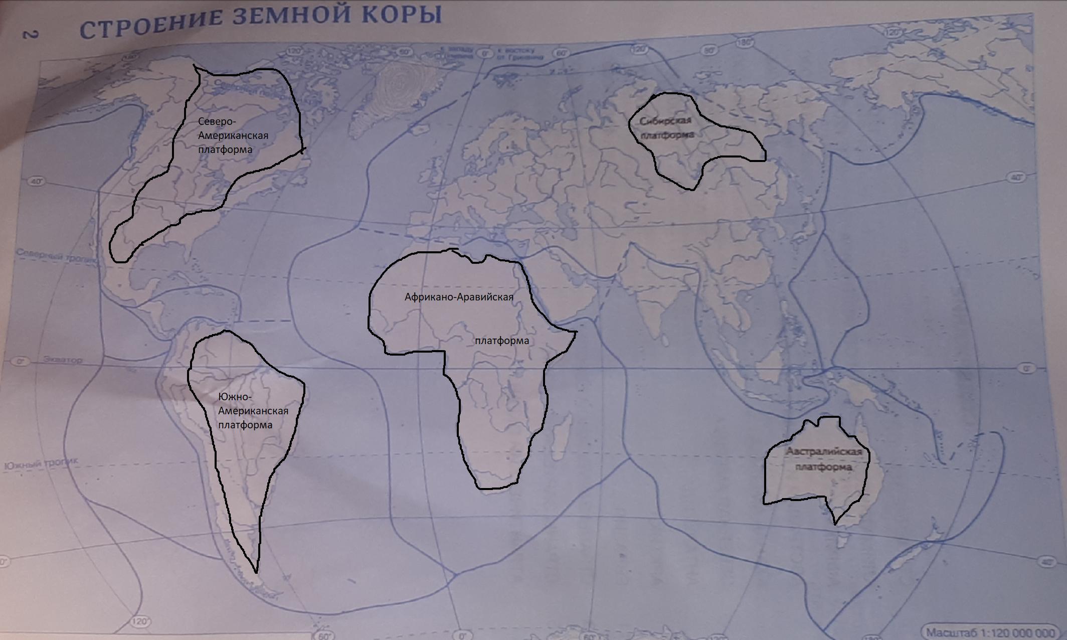 - Випишіть по одній назві платформ з кожного материка і позначте їх на контурній карті.