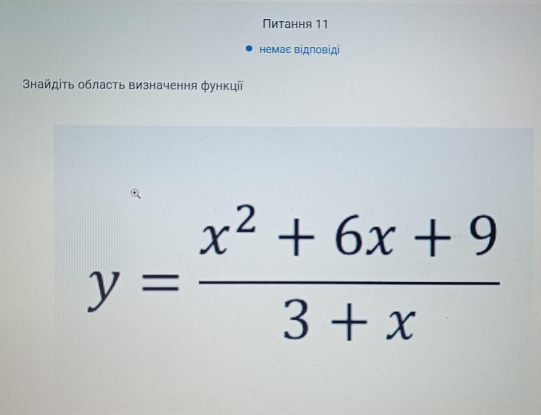 Область визначення функції - це набір усіх значень змінної, при яких функція визначена. Для функції y= x2 + 6x +9/ 3 +x функція буде визначена, якщо значення знаменника не дорівнює 0. Тобто, якщо 3 +x ≠ 0, тоді x ≠ -3.