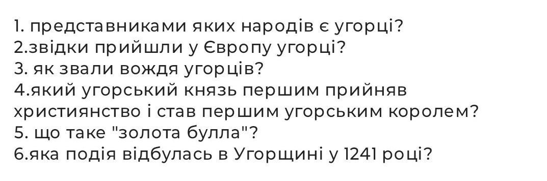 1. представниками 2.звідки прийшли 3. як звали вождя угорців? 4.який угорський князь першим прийняв яких народів є угорці? у Європу угорці? християнство і став першим угорським королем 5. що таке "золота булла"? 6.яка подія відбулась в Угорщині у 1241 році?