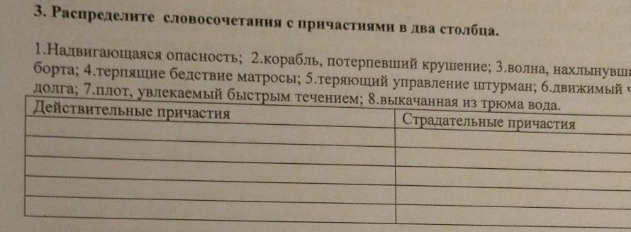 3. Распределите словосочетания с причастиями в два столбца. 1.Надвигающаяся опасность; 2.корабль, потерпевший крушение; 3.волна, нахлын борта; 4.терпящие бедствие матросы; 5.теряющий управление штурман; б.движим долга; 7.плот, увлекаемый быстрым течением; 8.выкачанная из трюма вода. Действительные причастия Страдател