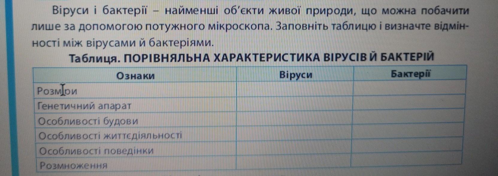 лише за допомогою потужного мікроскопа. Заповніть таблицю і визначте відмін-
