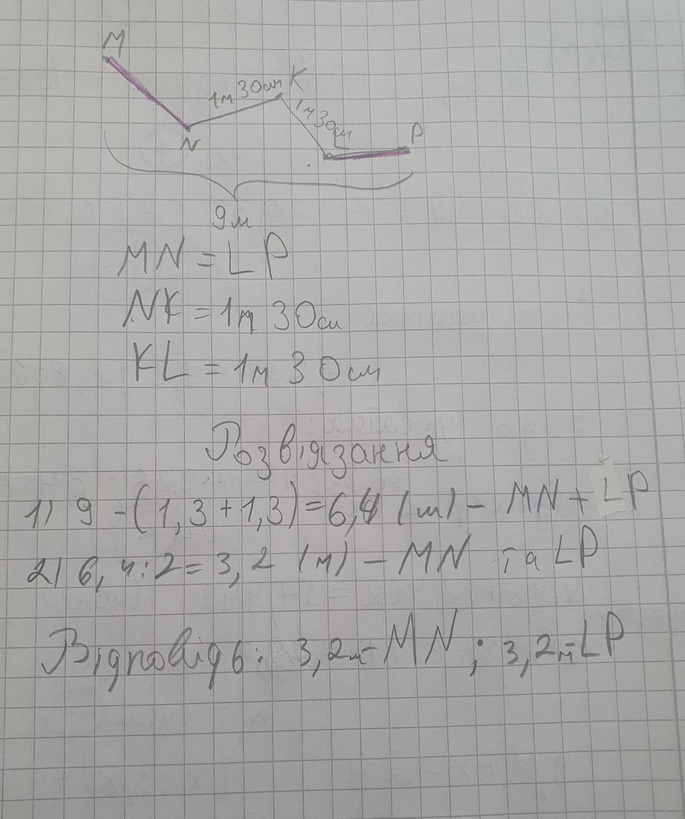 Розгляньте рисунок. Довжина ламаної MNKLP становить 9 м відомо що ланки ламаної MN та LP рівні між собою а довжина NK=1м 30 см та KL=1 м 30 см знайдіть довжини ланок Mn та LP