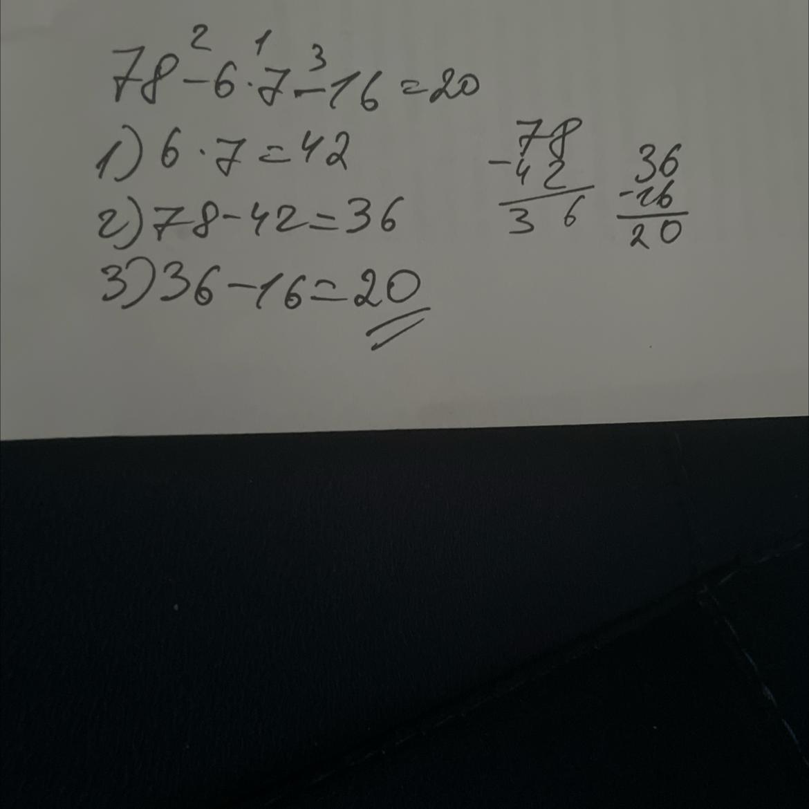сначала действия первого порядка(умножение), затем действия второго порядка(вычитание). Ответ: 20
