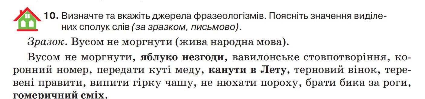Яблуко незгоди (пов'язаний із міфом про яблуко),Вавилонське стовпотворіння (походить з біблії,як люди намагалися побудувати у Вавилоні вежу),Коронний номер (походить з мови артистів),Передати куті меду (суперечка між одними знавцями),Канути в Лету (коли померлий пив з Лети воду,його душа забувала все,що пережила й бачила на землі. Звідси й постав цей вислів),Терновий вінок (Від Вавилона),Теревені правити (Від князів і простого народу),Випити гірку чашу (біблійне походження),Не нюхати пороху (народна мова),Брати бика за роги (унс),Геометричний сміх (походить від імені Гомера, який в «Ілліаді» описав сміх богів)