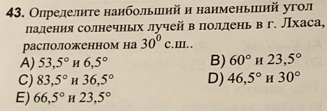 Наибольший угол падения солнечных лучей в полдень можно определить по формуле: 90° - широта места. В данном случае широта Лхасы 30° с.ш., поэтому наибольший угол падения составит 90° - 30° = 60°.
