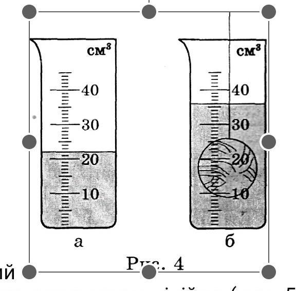 Коли Дмитрик опустив брелок у мірний циліндр із водою (рис. 4, а), то помітив, що рівень води в циліндрі підвищився (рис. 4, б). Визначте об'єм брелока Дмитрика