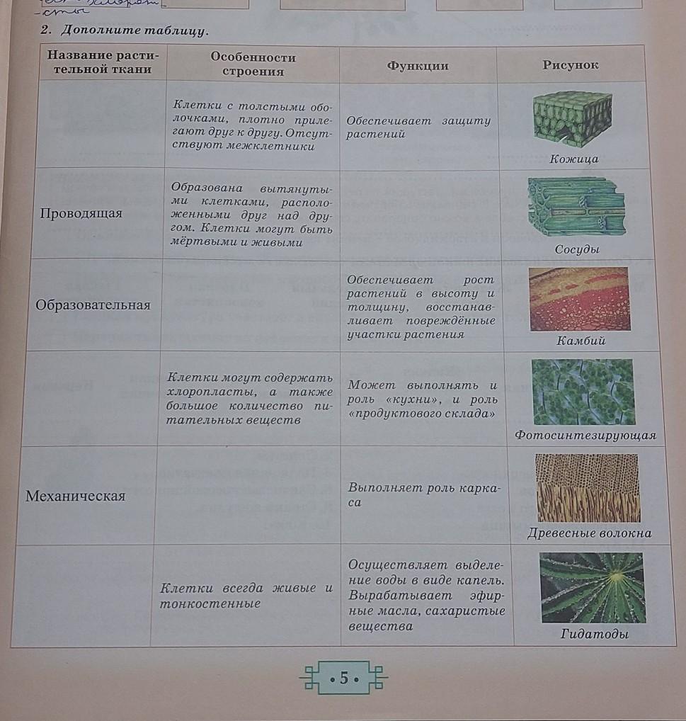 2. Дополните таблицу. Название расти- тельной ткани Проводящая Образовательная Механическая Особенности строения Клетки с толстыми обо- лочками, плотно приле- гают друг к другу. Отсум- ствуют межклемники Образована вытянумы- клетками, располо- женными друг над дру- гом. Клетки могут быть мёртвыми и живыми Mu Клетки могут содержать хлоропласмы, а макже большое количество nu- мательных веществ Клетки всегда живые и тонкосменные Функции Обеспечивает защиту растений росм Обеспечивает растений в высоту и молщину, восстанав- ливаем поврежденные участки растения Можем выполнять u роль «кухни», и роль «продуктового склада>> Выполняет роль карка- ca Осуществляет выделе- ние воды в виде капель. Вырабатываем эфир- ные масла, сахаристые вещества Рисунок Кожица Сосуды камбий Фотосинтезирующая Древесные волокна Гидамоды
