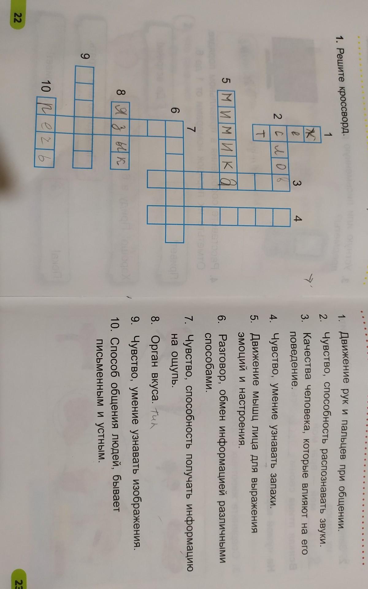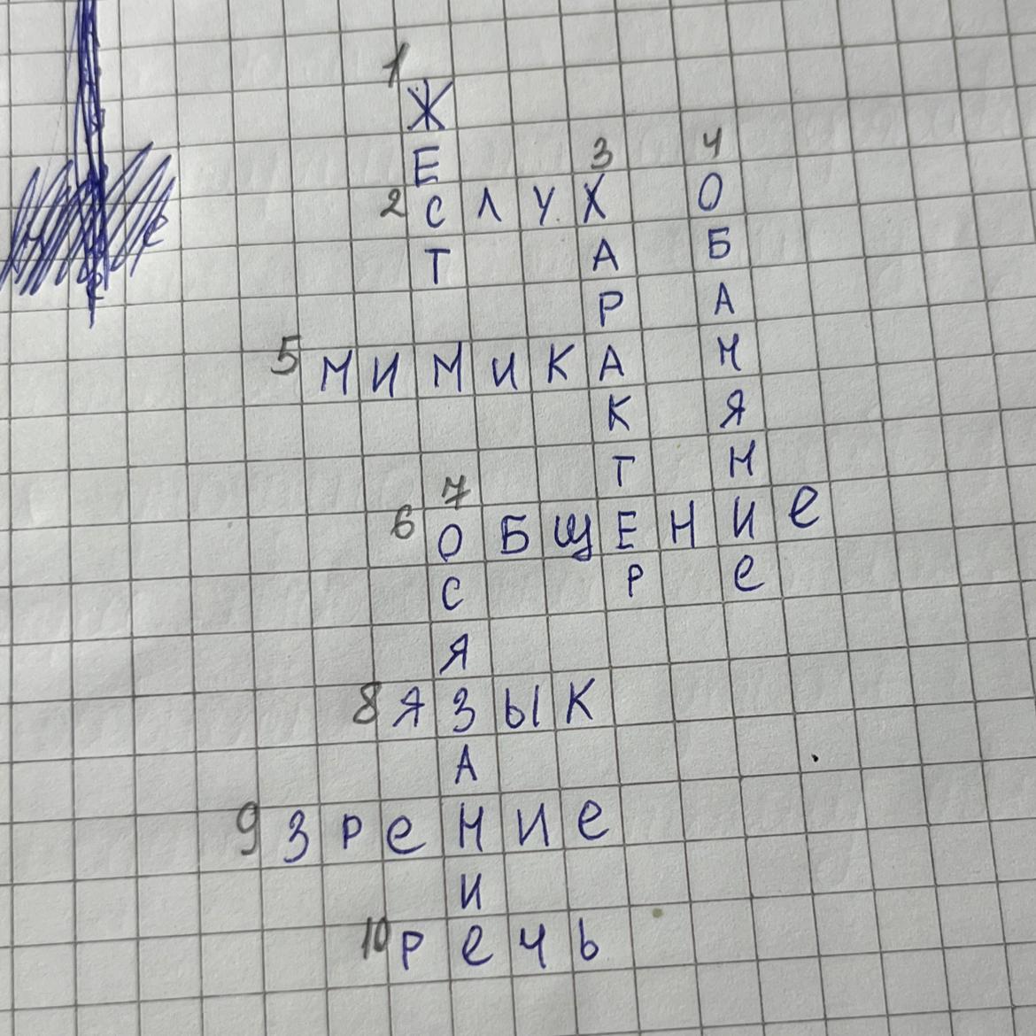 Движение рук и пальцев при общении. 2. чувство, способность распознавать звуки. Проверьте себя 3. Качества человека, которые влияют на его поведение. 4. 5. 6. Чувство, умение узнавать запахи. Движение мышц лица для выражения эмоций и настроения. Разговор, обмен информацией различными способами. 7. Чувство, способность получать информацию на ощупь. 8. Орган вкуса. Тик 9. Чувство, умение узнавать изображения. 10. Способ общения людей, бывает письменным и устным.