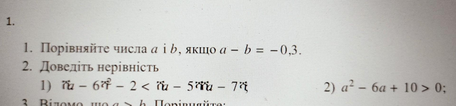 1. 1. Порівняйте числа а i ь, якщо а - b = -0,3. 2. Доведіть нерівність 1) K - 6* - 2 < ба - 57а - 7 Відомо шо >ь Порівняйте. 2) а² - ба + 10 > 0;