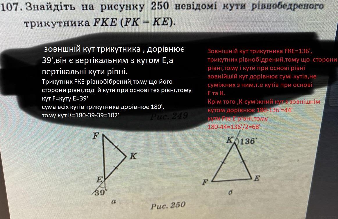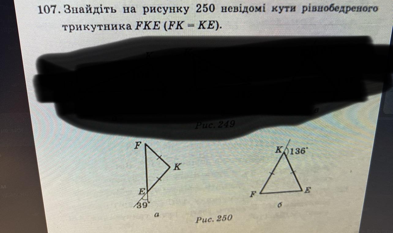Трикутник FКЕ-рівнобібрений,тому що його сторони рівні,тоді й кути при основі теж рівні,тому кут F=куту Е=39'