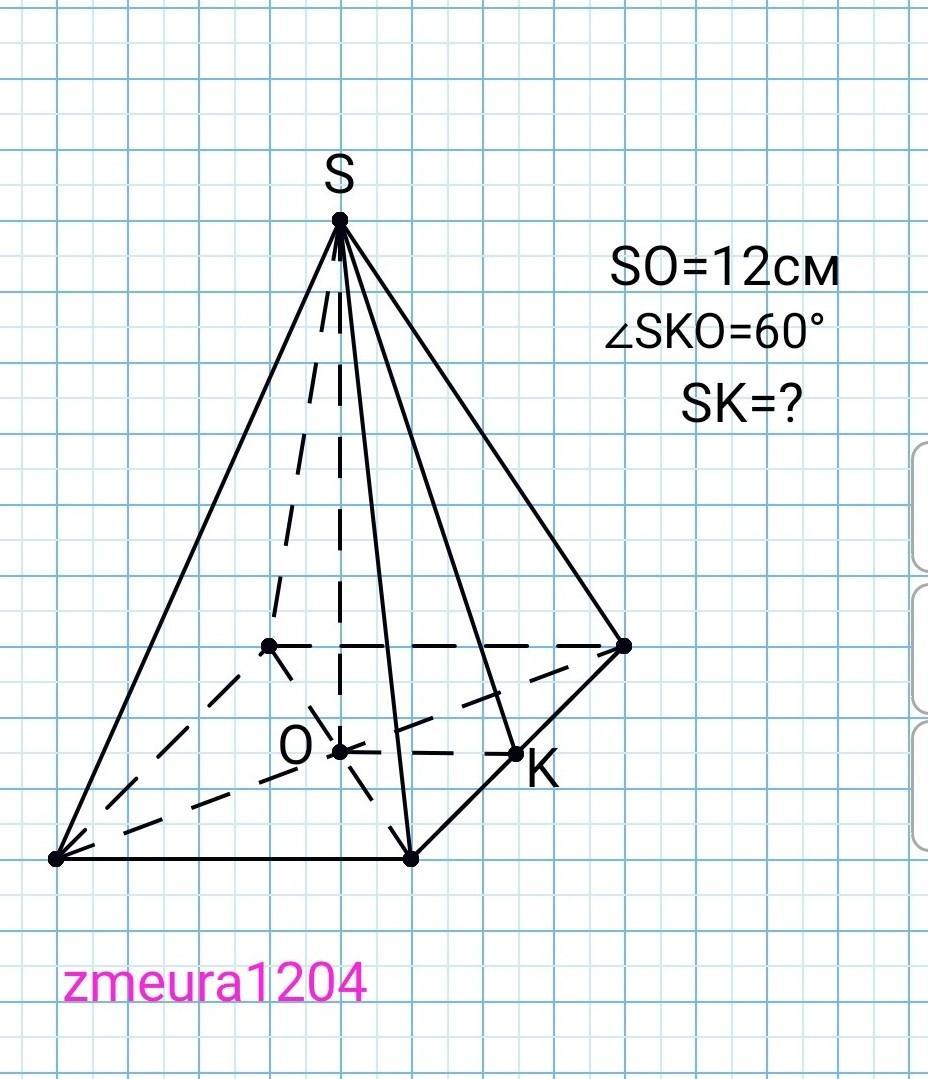 У правильній чотирикутній піраміді бічна грань нахилена до основи під кутом 60 висота дорівнює 12 см. Знайдіть апофему