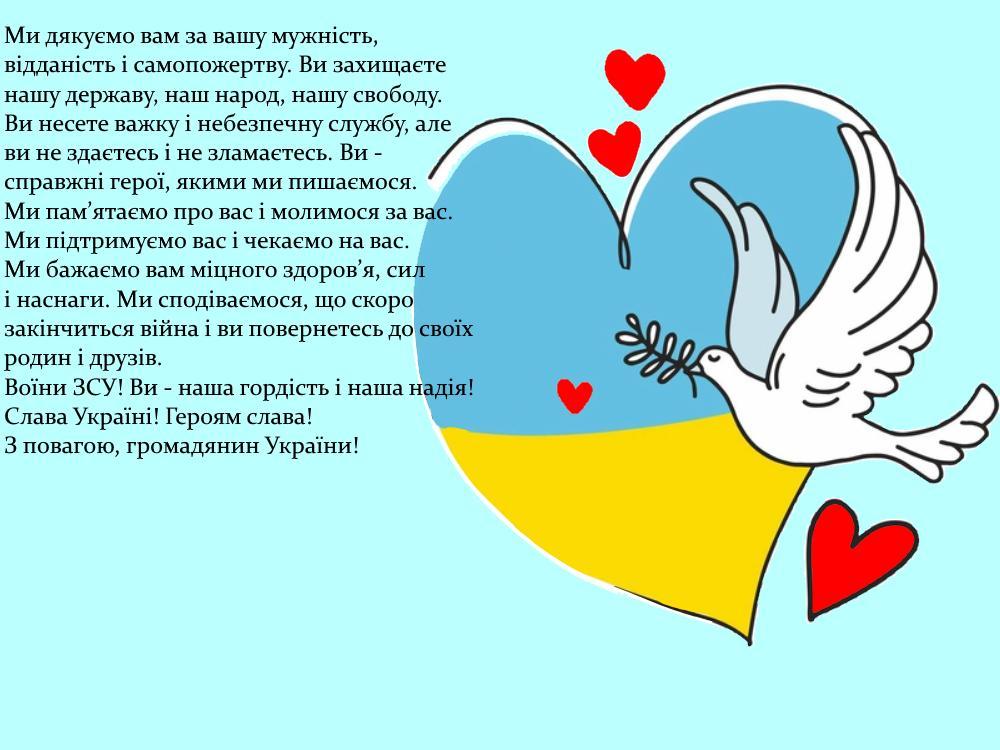 Ми дякуємо вам за вашу мужність, відданість і самопожертву. Ви захищаєте нашу державу, наш народ, нашу свободу. Ви несете важку і небезпечну службу, але ви не здаєтесь і не зламаєтесь. Ви - справжні герої, якими ми пишаємося і яким ми довіряємо.