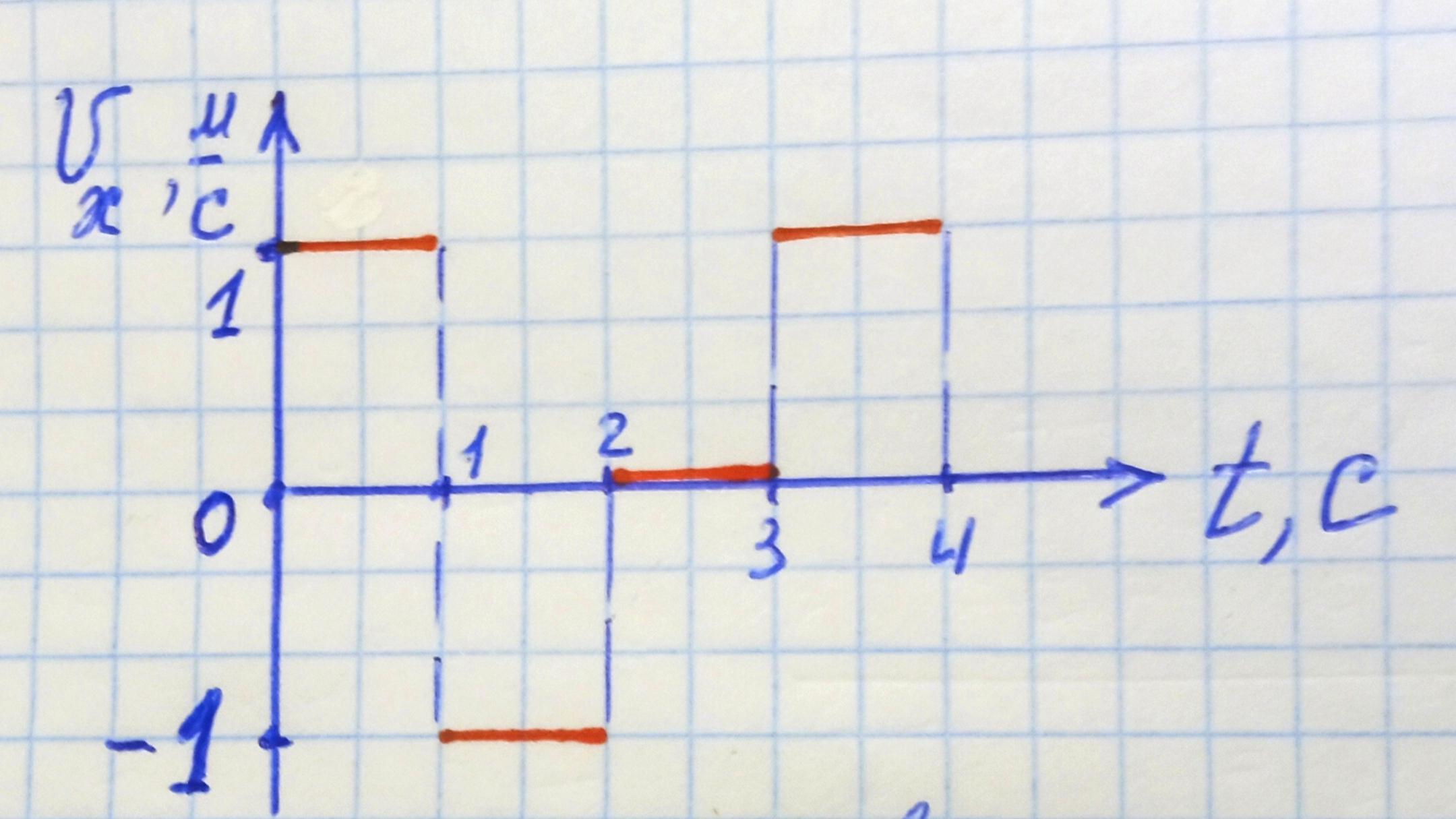На всех участках равномерное движение с постоянной скоростью 1м/c; -1м/c; 0м/c; 1м/c соответственно.