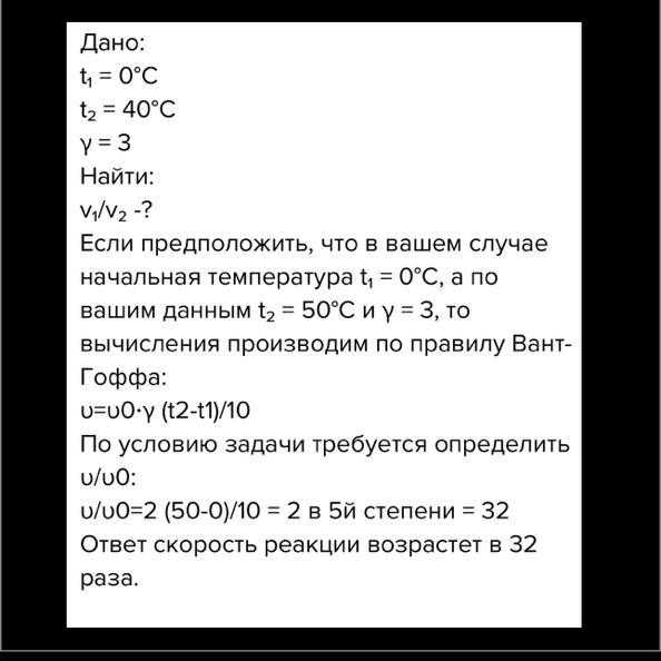 Как измениться скорость химической реакции при нагревании на 50° если температурный коэфицент равен двум?