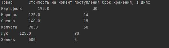print("Товар\t\tСтоимость на момент поступления\tСрок хранения, в днях")