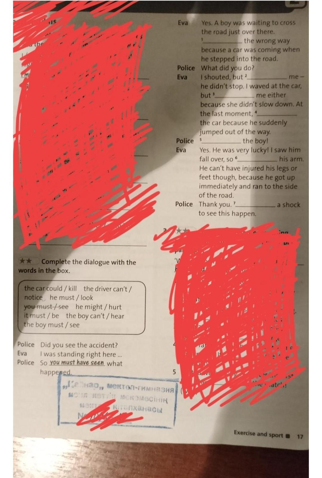 Eva: I shouted, but the boy can't have heard me- he didn't stop. I waved at the car, but the driver can't have noticed me either because she didn't slow down. At the last moment, the boy must have seen the car because he suddenly jumped out of the way.