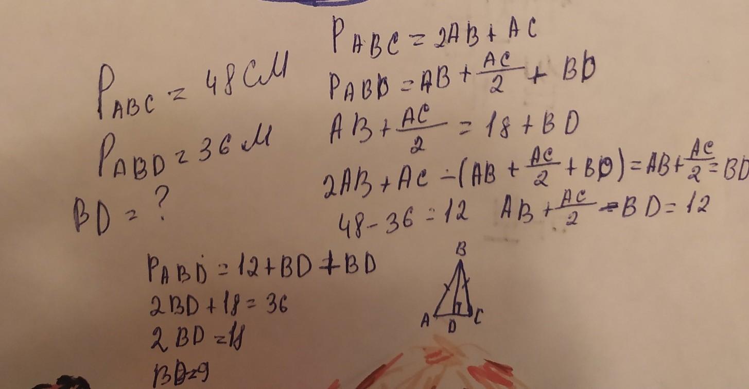 Периметр треугольника = 48 см, а периметр треугольника = 36 см. Рассчитай длину BD.