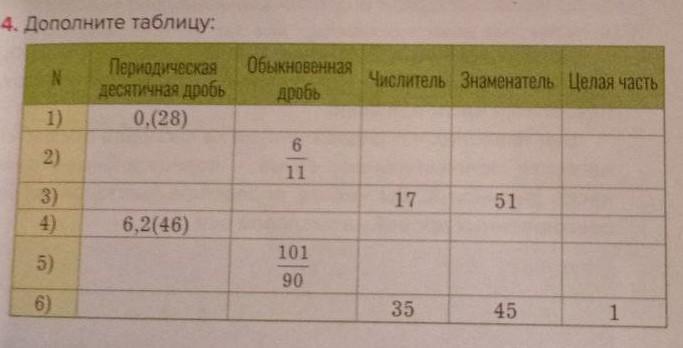 Дополните таблицу: Периодическая десятичная дробь 0,(28) N 1) 2) 0 3) 4) 34 5) 6) 6,2(46) Обыкновенная дробь 6 11 101 90 Числитель Знаменатель Целая часть 17 35 51 45 1