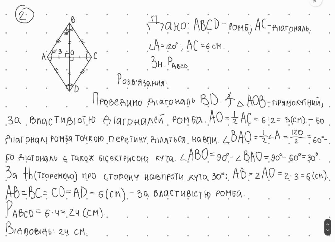 З вершини кута ромба, що дорівнює 120 градусів, проведена діагональ завдовжки 6 см. Знайдіть периметр ромба.