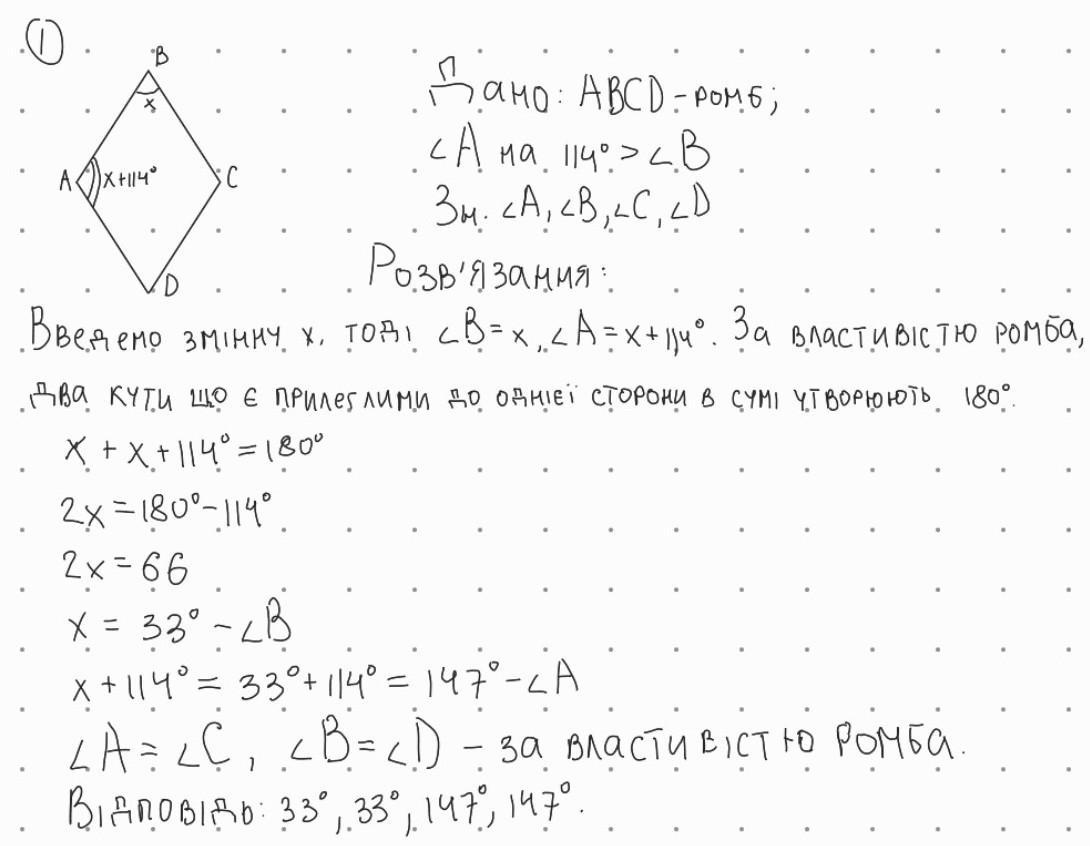 Знайдіть кути ромба, якщо один із них на 114 градусів більший за інший.
