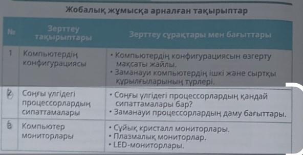 НЕ ОБРЯЩЯЙТЕ ВНИМАНИЕ НА ТЕКСТ МНЕ БЫ ТОЛЬКО 2/326 Үй тапсырмасы Жобалык жумыска арналған тақырыптар Зерттеу тақырыптары 1 Компьютердiн конфигурациясы 2 Сонгы улгiдегi процессорлардың сипаттамалары 6 Компьютер мониторлары Зерттеу сұрақтары мен бағыттары Компьютердiң конфигурациясын өзгерту максаты жайлы. . Заманауи компьютердiң iшкi және сыртқы құрылғыларының түрлері. Сонгы улгiдегi процессорлардың қандай сипаттамалары бар? . Заманауи процессорлардың даму бағыттары. . . . • Суйык кристалл мониторлары. . Плазмалық мониторлар. • LED-мониторлары. .