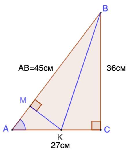 В прямоугольном треугольнике ABC биссектриса острого угла ABC пересекает катет AC в точке K. Найдите расстояние от точки K до гипотенузы AB, если AB=45, AC=27, BC=36.