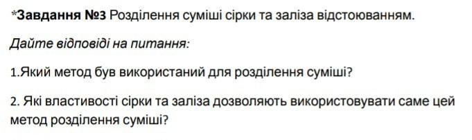 1.Для розділення суміші сірки та заліза був використаний метод відстоювання.