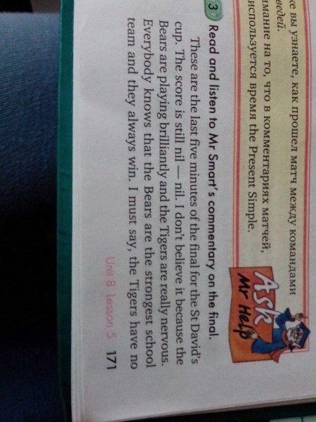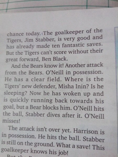 Последние пять минут финала за кубок Дэвида. Счет еще нуль ноль. Я не могу поверить этому потому что Медведи играют превосходно и тигры действительно нервничают. Все знают что медведи сильнейшая школьная команда и они всегда выигрывают. я должен сказать. что тигры не имеют шансов сегодня. Вратарь тигров, Джим Стаббер. очень хорош и уже 10 раз сделал фантастические защиты (защитил ворота). Но тигры не могут открыть счет без их великолепного нападающего, Бена Блека.