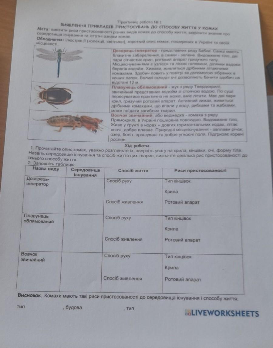 Проктична робота № 1 ВИЯВЛЕННЯ ПРИКЛАДІВ ПРИСТОСУВАНЬ ДО СПОСОБУ ЖИТТЯ У КОМАХ Мета виявити риси пристосованостi рiзних видів комах до способу життя за середовища існування та юстотнознаки комах Обладнання: ілюстрації (коле і світлини), короткий опис комах, поширених в Украине та соня місцевості. 2. Заповніть таблицю Назва виду ТИП Хід роботи: 1. Прочитайте опис комах, уважно розгляньте ïх, зверніть увагу на крила, кінцівки, очі, форму na Назвіть середовище існування та спосіб життя цих тварин, визначте декілька рис пристосованості до їхнього способу життя. Дозорець- імператор Плавунець облямований Вовчок Звичайний До орець імператор представник раду бабки. Сам блакитне забарвлення, а самки - зелено Видое пари сітчастих крип, ротовий апарат гризучого типу Місцекснуваннями с узлісся та лісов берегів водойм. Хижаки, живляться до ни комахами. Здобич ловить уповiтр кошик папок. Вели відстані 12 м допомог дозволяють бачити доба Плавунець облямований жук з ряду Терпи звичайний представник водойм аl стоячою водою. По опш пересуватися практично не може вме птати Мас дві пари крил, гризучий ротовий апарат. Активний хижак житься дрiбними комахами, що впали у воду, рибками та жабками, може поїдати загиблих тварин Вовчок звичайний, або ведмедка - комаха з ряду Прямокрилі, в Україні поширена повсюдно. Видовжене тло Живе у ґрунті в норах - довгих горизонтальних ходах, тас вноч, добре плавас. Природнi мiсцеiснування - озер, бол зрошуванi та добре угносн ля. П рослин. корен Середовище існування Спосіб життя Спосіб руху Спосіб живлення Спосіб руху Спосіб живлення Спосіб руху Спосіб живлення тип Риси пристосованості Тип кінцівок Крила Ротовий апарат по д Тип кінцівок Крила Ротовий апарат Тип кінцівок Крила Ротовий апарат Висновок. Комахи мають такі риси пристосованостi до середовища існування і способу життя: будова GaLIVEWORKSHEETS
