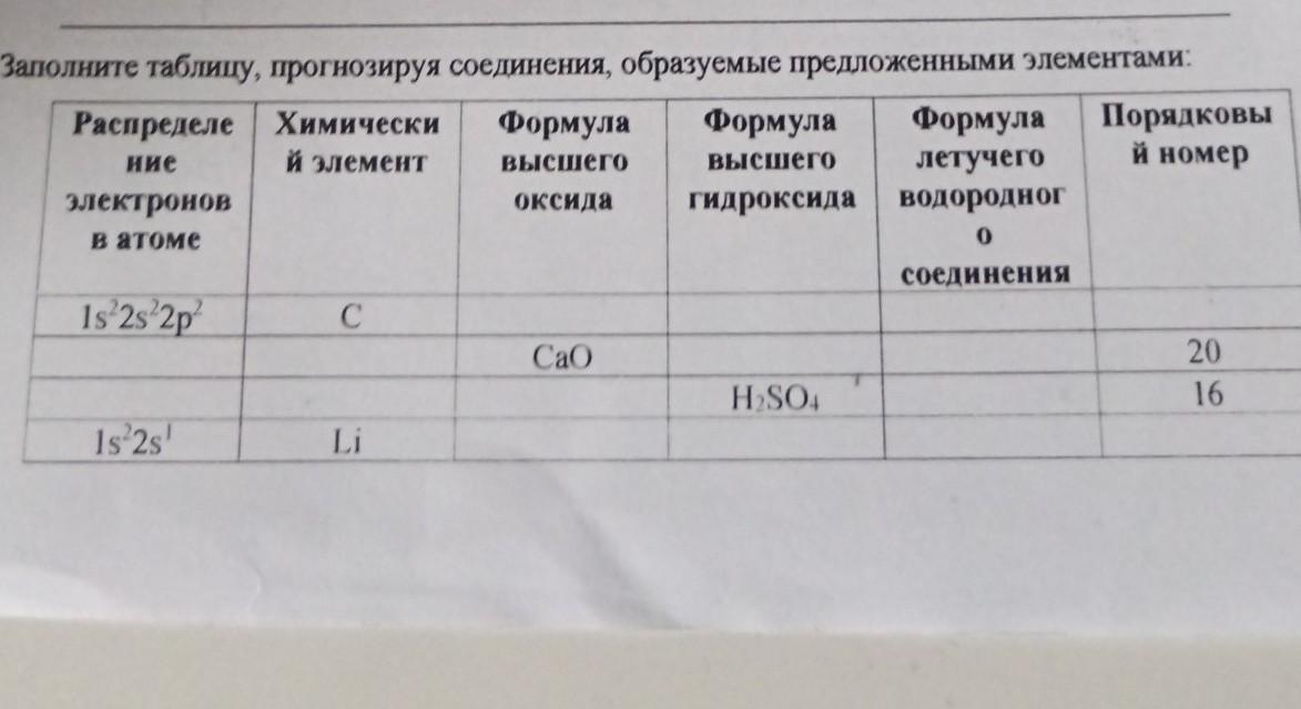 3 Заполните таблицу, прогнозируя соединения, образуемые предложенными элементами: Химически Формула Формула Формула Порядковы й элемент высшего высшего летучего й номер оксида гидроксида водородног 0 соединения Распределе ние электроноВ в атоме 1s22s22p2 1s22s¹ с Li CaO H₂SO4 20 16