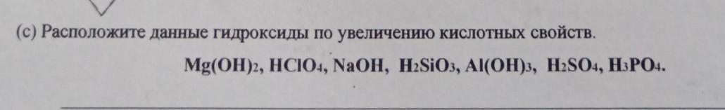 (с) Расположите данные гидроксиды по увеличению кислотных свойств. Mg(OH)2, HClO4, NaOH, H2SiO3, Al(OH)3, 24, 34