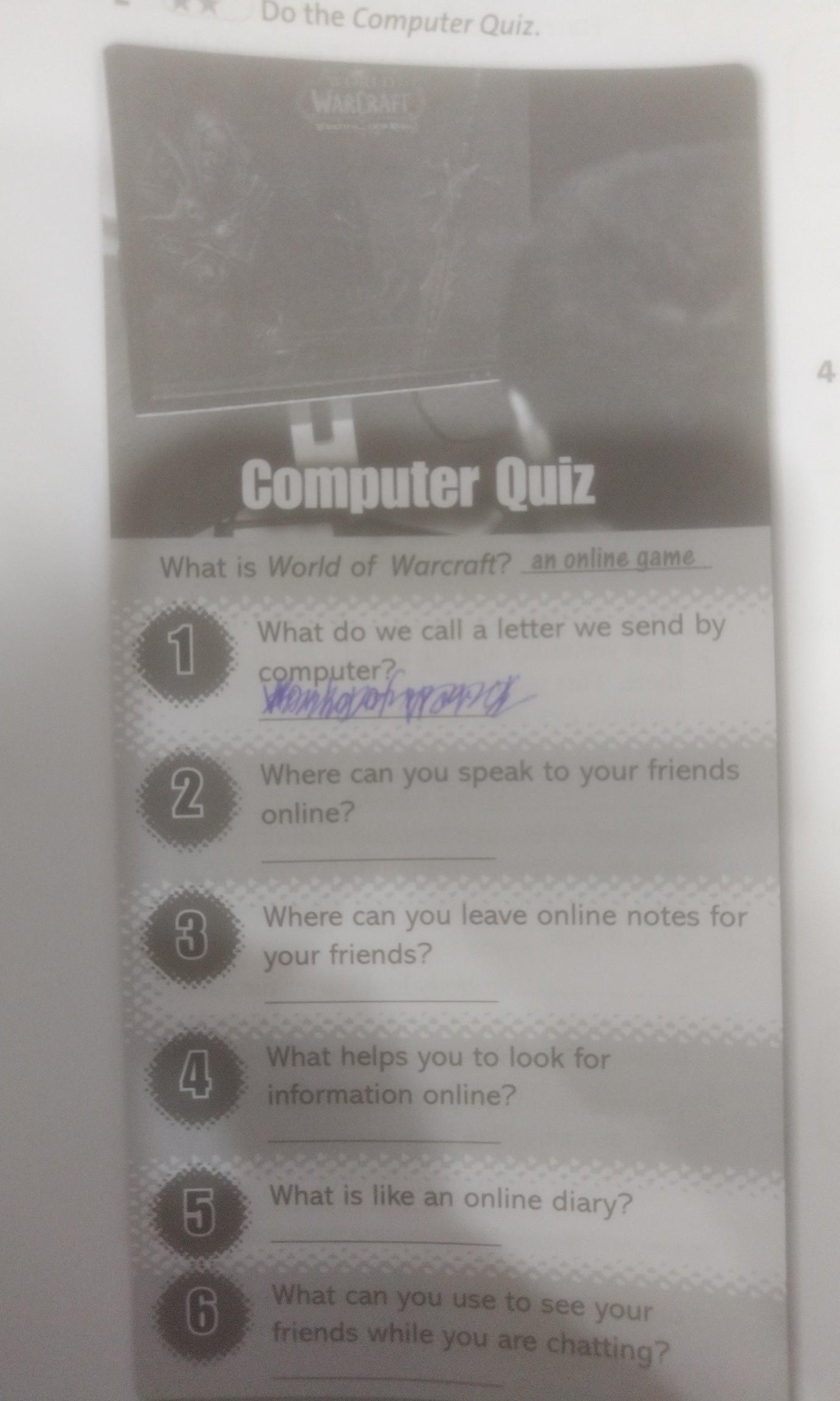 2 ★ Do the Computer Quiz. Computer Quiz What is World of Warcraft? an online game What do we call a letter we send by computer? 1 2 3 4 WARDRAFT 5 6 Where can you speak to your friends online? Where can you leave online notes for your friends? What helps you to look for information online? What is like an online diary? What can you use to see your friends while you are chatting?