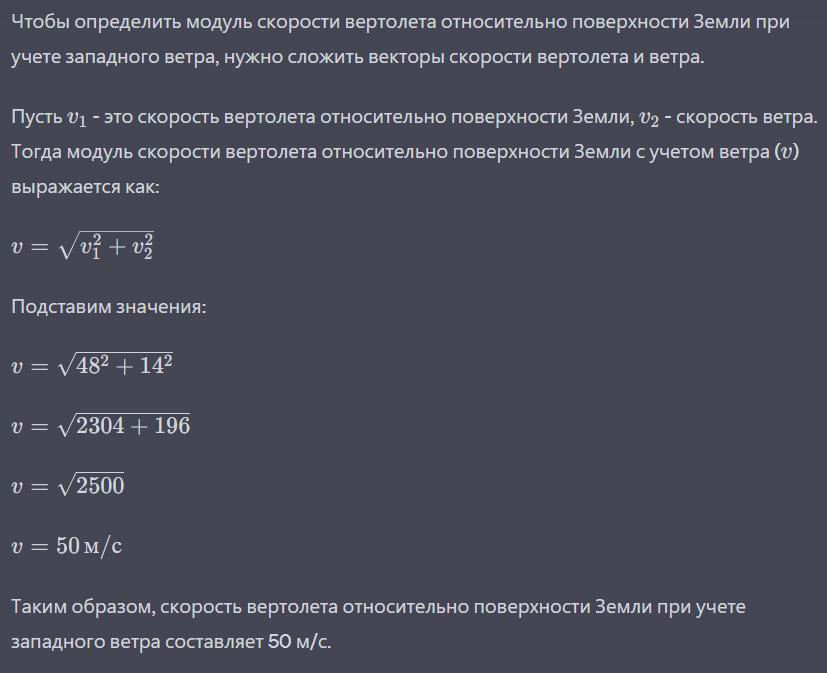 Вертолёт в безветренную погоду летел на север со скоростью модуль которой v1=48 м/с относительно поверхности Земли. Определите модуль скорости с которой будет лететь вертолёт относительно поверхности Земли если подует западный ветер со скоростью модуль которой v2=14 м/с.