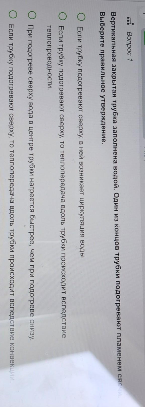 Правильное утверждение: Если трубку подогревают сверху, то теплопередача вдоль трубки происходит вследствие конвекции.