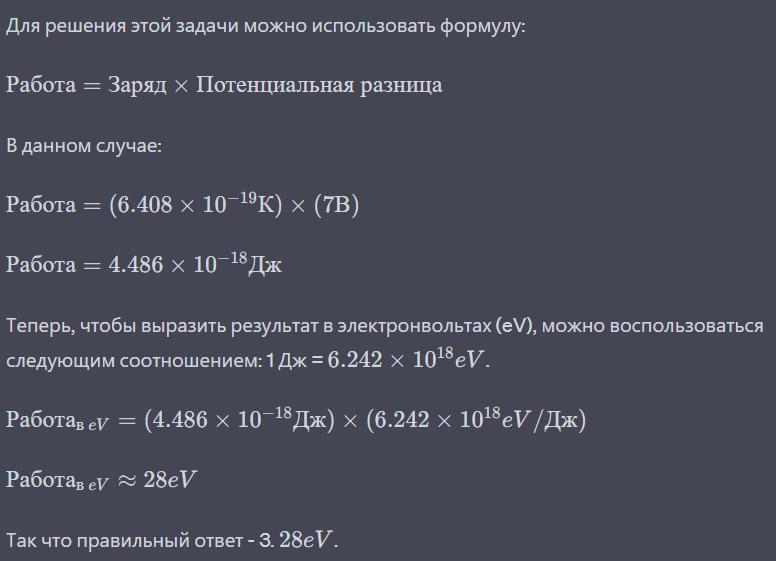 Ответ: Количество работы, совершаемой при перемещении заряда в 6.408 x 10^-19 К через потенциальную разницу 7 В, составляет приблизительно 28 электронвольтов (eV). Таким образом, верный ответ - 3. 28eV.