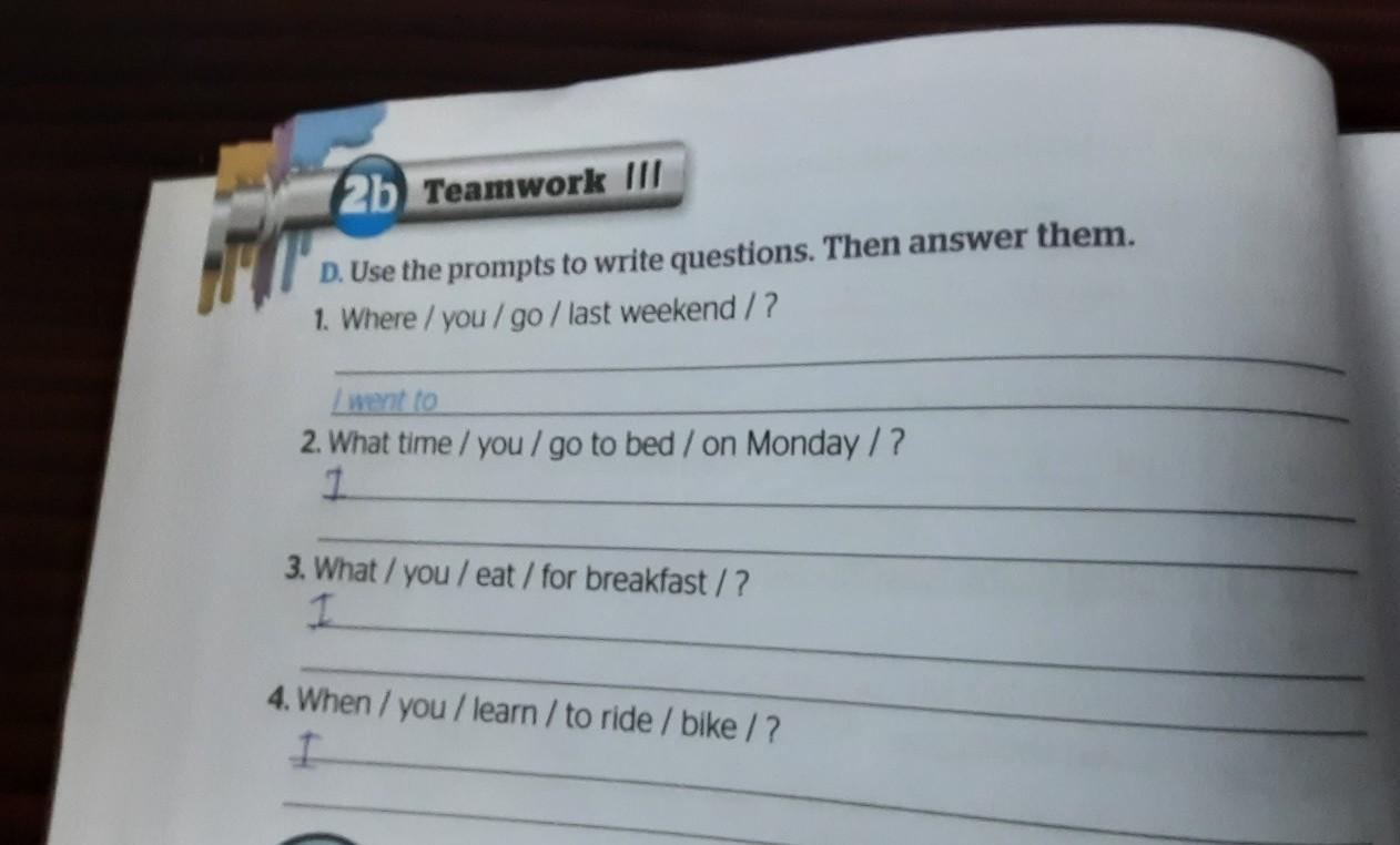 2b Teamwork III D. Use the prompts to write questions. Then answer them. 1. Where/you/ go / last weekend/? I went to 2. What time / you / go to bed / on Monday/? 1 3. What / you/eat / for breakfast / ? I 4. When / you/learn/ to ride / bike /? I