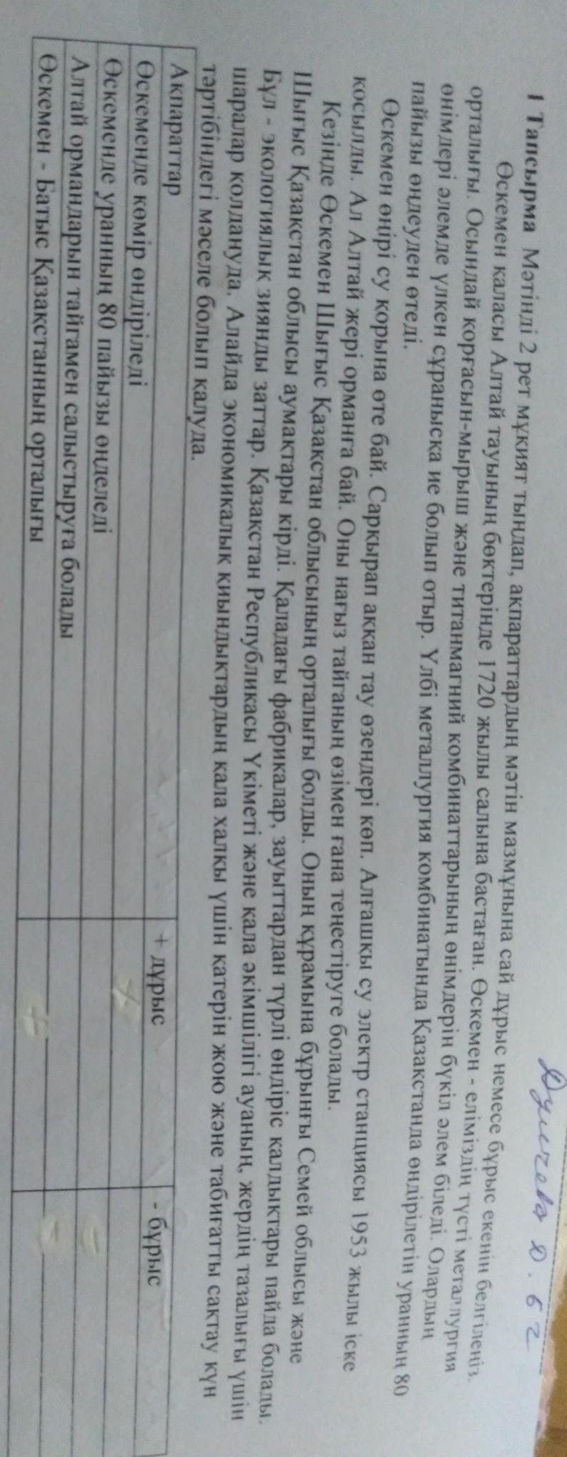 1 Тапсырма Мәтiндi 2 рет мукият тындап, акпараттардын мәтін мазмұнына сай дұрыс немесе бұрыс екенiн белгiленiз. Өскемен каласы Алтай тауынын бектерiнде 1720 жылы салына бастаған. Өскемен - елiмiздiн түсті металлургия орталыгы. Осындай корғасын-мырыш және титанмагний комбинаттарынын әнiмдерiн бүкіл әлем бiледi. Оларды енiмдерi әлемде улкен сұранысқа ие болып отыр. Улбi металлургия комбинатында Қазақстанда өндірілетін ураннын 80 пайызы өндеуден өтеді. Өскемен енірі су корына өте бай. Саркырап аккан тау өзендері көп. Алгашкы су электр станциясы 1953 жылы іске косылды. Ал Алтай жерi орманга бай. Оны нагыз тайганын өзiмен гана теңестіруге болады. Кезiнде Өскемен Шығыс Қазақстан облысынын орталығы болды. Оның құрамына бұрынғы Семей облысы және Шығыс Қазақстан облысы аумактары кiрдi. Қаладагы фабрикалар, зауыттардан түрлi өндiрiс калдыктары пайда болады. Бул - экологиялык зиянды заттар. Казакстан Республикасы Үкіметі және кала әкiмшiлiгi ауанын, жердің тазалығы үшін шаралар колдануда. Алайда экономикалык киындыктардын кала халкы үшiн катерiн жою және табиғатты сактау кун тәртiбiндегi мәселе болып калуда. + дұрыс Акпараттар бұрыс Өскеменде көмір өндiрiледi Өскеменде ураннын 80 пайызы енделеді Алтай ормандарын тайгамен салыстыруга болады Өскемен - Батыс Казакстаннын орталығы