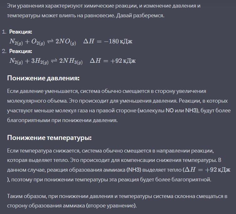 Таким образом, при понижении давления и температуры система склонна смещаться в сторону образования аммиака (второе уравнение).