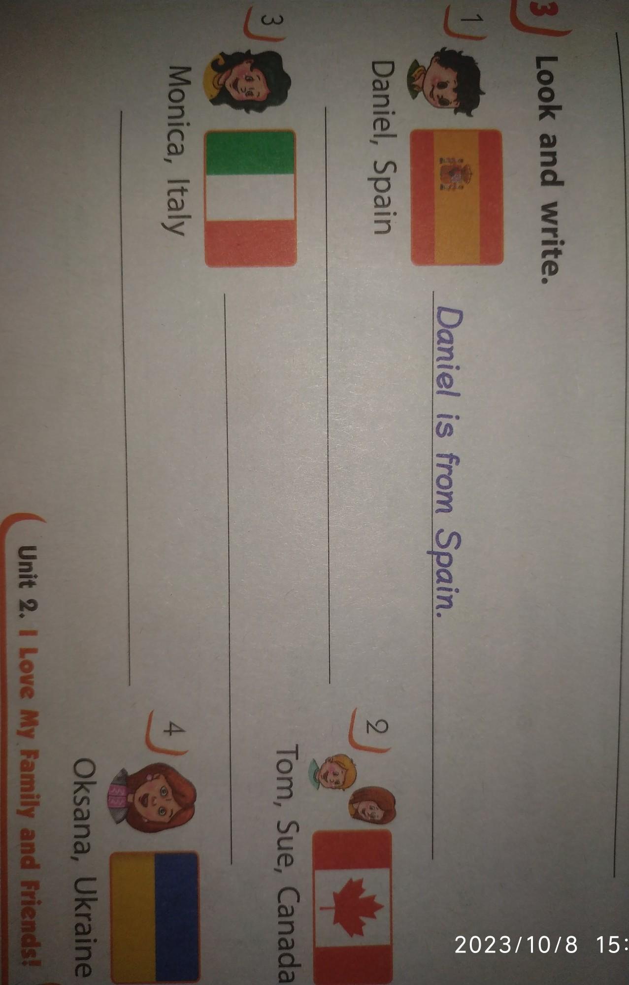 1 3 Look and write. Daniel, Spain Monica, Italy Daniel is from Spain. 2 4 Tom, Sue, Canada Oksana, Ukraine