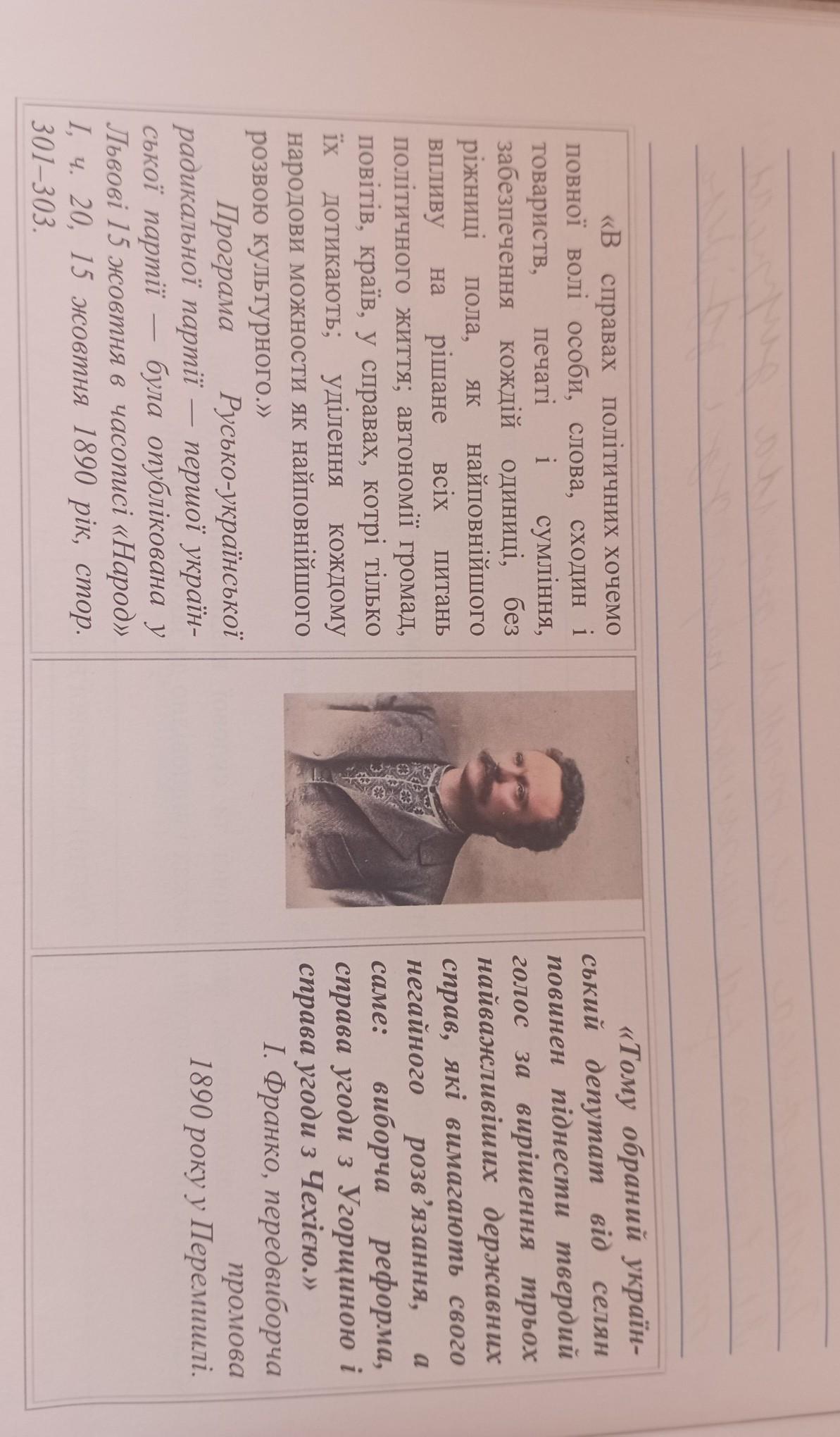 6. Вправа «Передвиборча програма І. Франка» Ознайомся з уривками програми першої української партії та передвиборчої промови Івана Франка. Знайди у тексті програми проблеми, які були актуальними для українців наприкінці XIX століття. Добери з промови Івана Франка словосполучення, яке описує спосіб вирішення цих проблем. Запиши свої міркування.