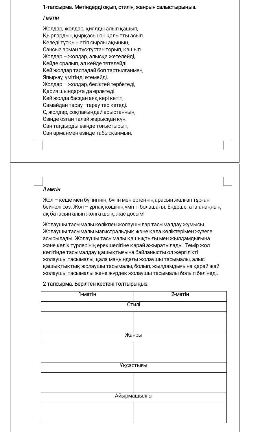Айырмашылығы 1 мәтін: Бірінші мәтінде жол астарлы мағынада айтылады. Фантазия және салыстыру элементтерімен.