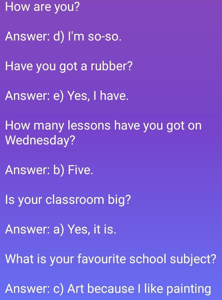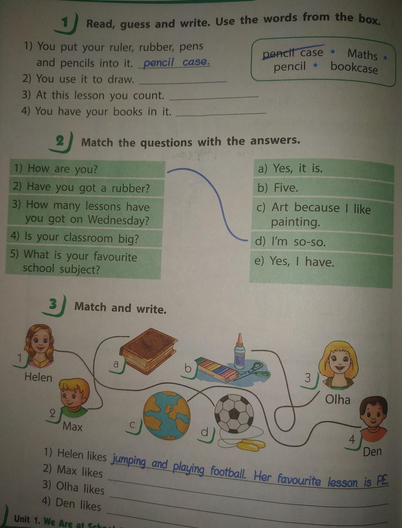 Read, guess and write. Use the words 1) You put your ruler, rubber, pens and pencils into it. pencil case. 2) You use it to draw. 3) At this lesson you count. You have your books in it. 2 Match the questions with the answers. 1) How are you? 2) Have you got a rubber? 3) How many lessons have you got on Wednesday? 4) Is your classroom big? 5) What is your favourite school subject? box. pencil case Maths pencil bookcase a) Yes, it is. b) Five. c) Art because I like painting. d) I'm so-so. e) Yes, I have.